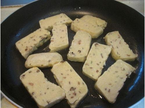 5. 炸薯粿:锅中倒入适量的植物油,油温升至5成热时,放入薯粿,中火炸至金黄酥脆。注意翻面,确保两面都炸得金黄。